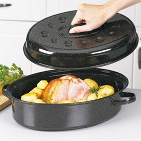 Cook succulent meat or poultry in their own steam in this family-sized, self-basting roaster. Our Oval Enamel Roaster With Lid is ideal for cooking up some great family meals. Roast poultry and meat to succulent perfection in this family-sized, self-basting roasting pan. Our enamel roasting pan is dishwasher safe and very durable and we are sure it will become one of your favourite items of kitchen cooking equipment. Scratch and stain resistantSuitable for 2.5kg chicken or a 3.5kg (7lb) jointDishwasher safe for easier cleaningDimensions 37 x 26.5 x 16cm (including lid)